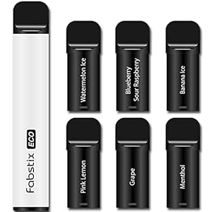 VapeMaster Disposable Vape Pens Starter Kit Fabstix ECO, Rechargeable Battery, 6 Prefilled PODs Watermelon Ice, Blueberry Sour Raspberry, Banana Ice, Pink Lemon, Grape, Menthol – No Nicotine